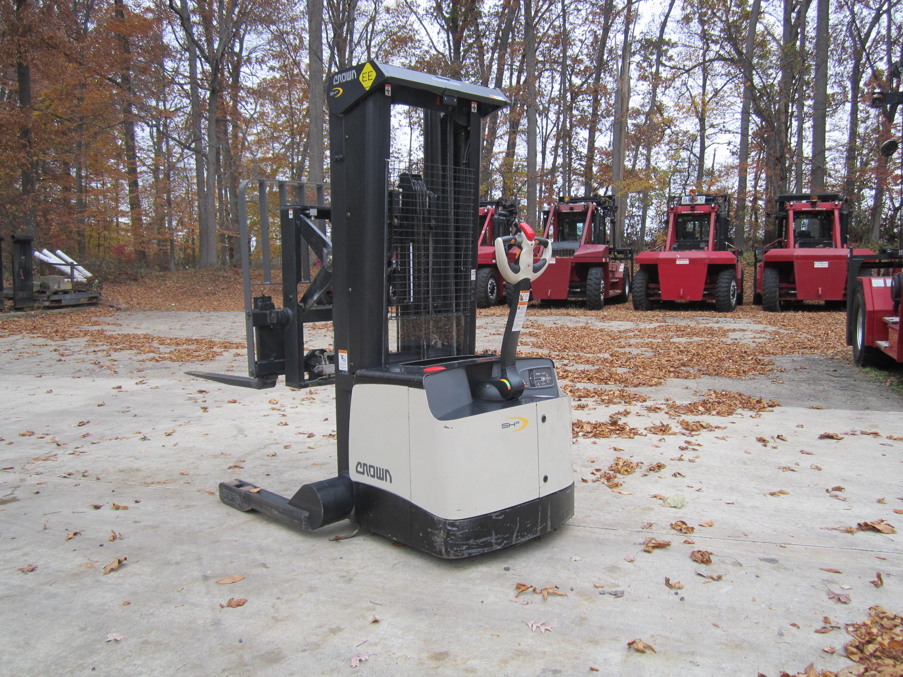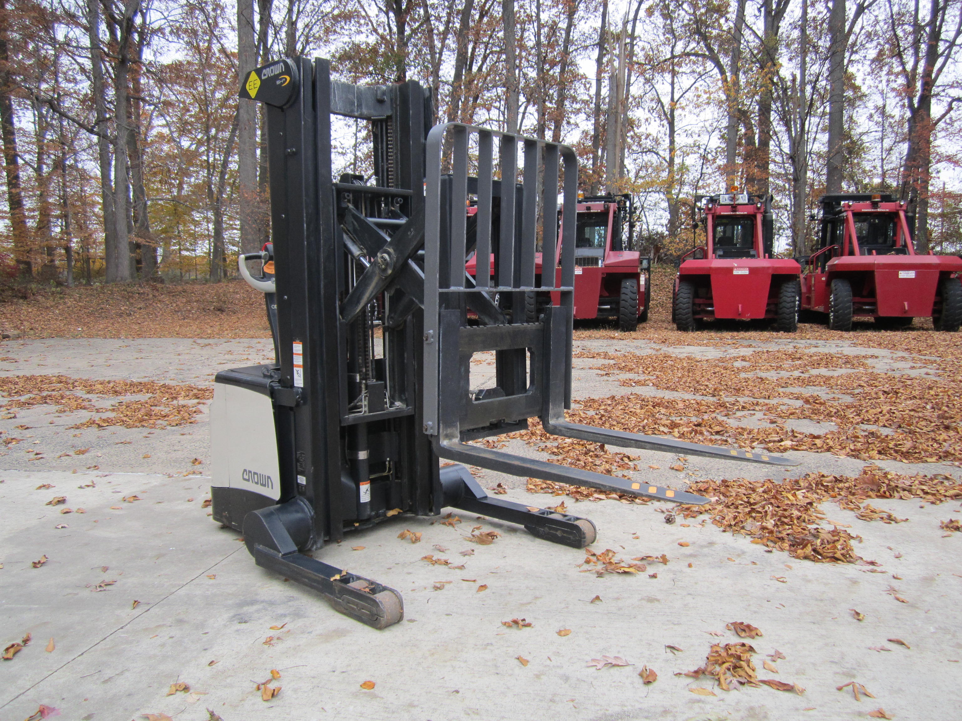 The OD of the straddle leg is 52 inches and the ID of the straddle leg is 43.75 inches. It is equipped with 42 inch forks, a 24V industrial battery, EE rated, and has a toggle switch instead of a key to power the unit on. H1 hours are 6,466.